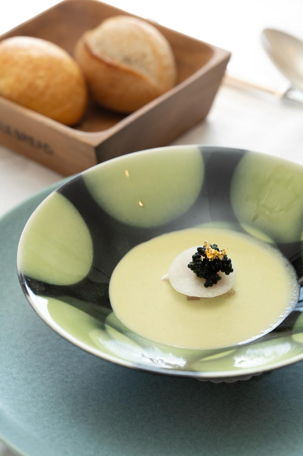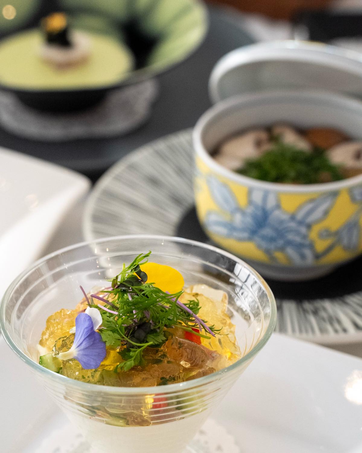 - 千葉県産鯵のタルタル カリフラワーのクーリ きのこたっぷりコンソメスープ